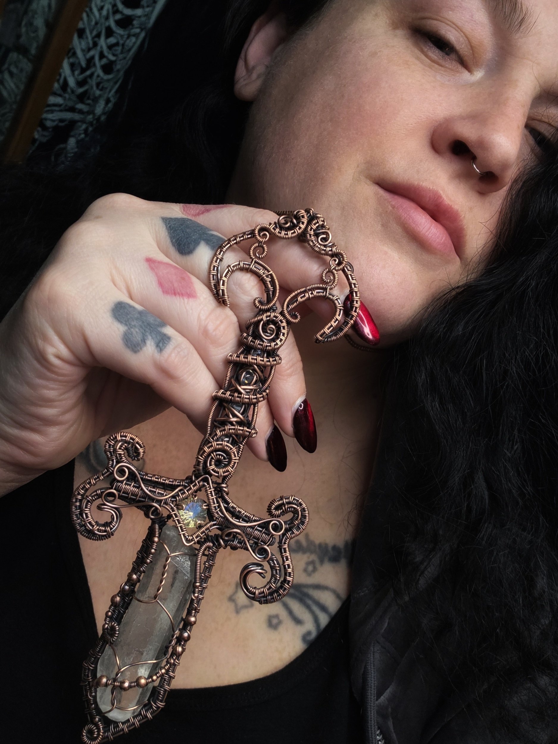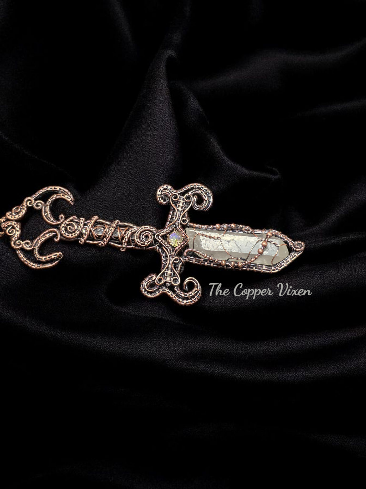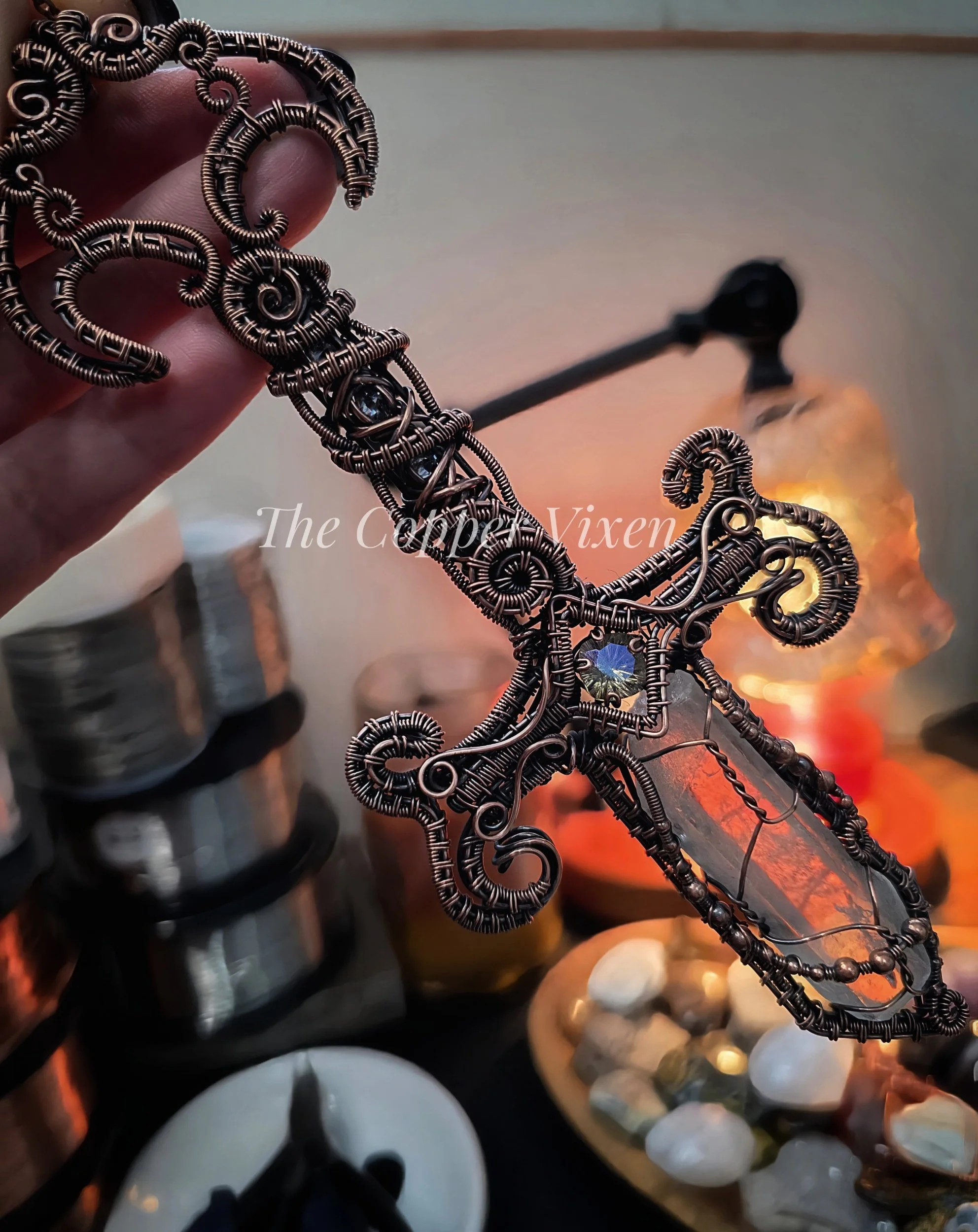 All wrapped and woven by hand with raw copper and carefully curated crystals, glass, and found objects.