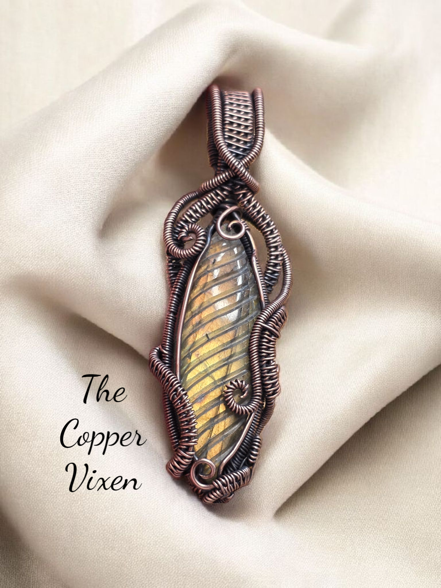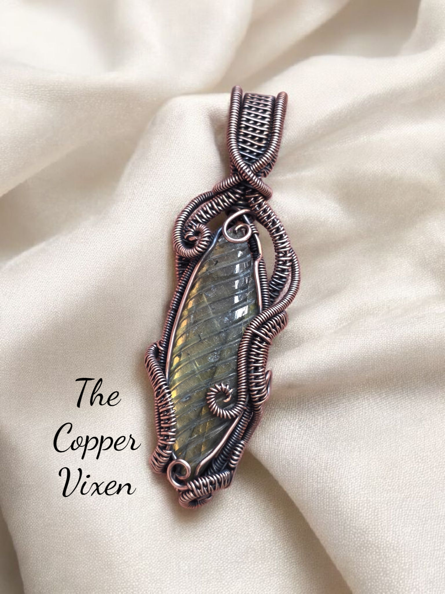 This labradorite has such a delicate , yet powerful glow. Almost like a flash of golden light. The carving really enhances the effect which makes it the perfect adornment for any flashy human.